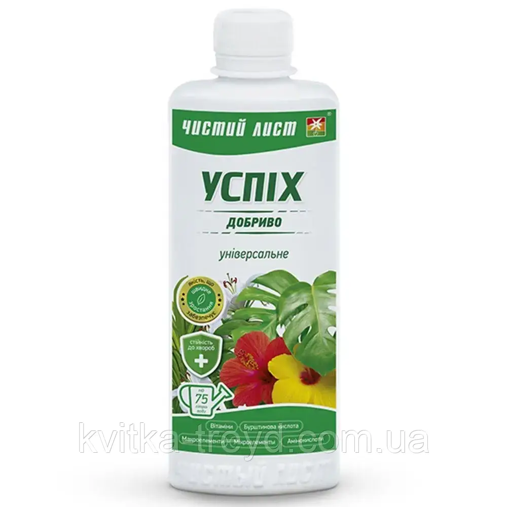 Успіх добрива універсальне 310 мл, Чистий лист Чистий лист Успіх добриво універсальне — повноцінна комплексна мінеральна підживка для всіх різновидів кімнатних рослин. Правильне харчування рослин — запорука здоров'я й чудового стану ваших квітів. Переваги: - Містить усі необхідні елементи для живлення рослини в легко засвоюваній формі. — Сприяє розвитку кореневої системи, потужному зростанню листової поверхні крони рослини. - Запобігає розвитку хлорозу. Спосіб застосування: Вміст 310 мл вистачає на 75 літрів води. Використовуйте відстійну або кип'ячену воду t 20-25C. Періоди розвитку Полив Обприскування Період росту 1 ковпачок на 1,5 літра води 3-4 рази на місяць 1 ковпачок на 3 літри води 2-3 рази на місяць Період спокою 1 ковпачок на 2 літри води 1-2 рази на місяць 1 ковпачок на 3 літри води 1-2 рази на місяць Заходи: виробляти обробку в місцях, віддалених від скупчення людей і тварин. У разі неможливості пересування рослин забезпечити їх брак під час оброблення рослини. Не обробляти на кухні. Не допускати потрапляння в їжу та воду. У разі потрапляння в очі промити великою кількістю води. У разі потрапляння препарату всередину організму, за допомогою рясного пиття, викликати блювання, прийняти активоване вугілля звернутися до лікаря.
